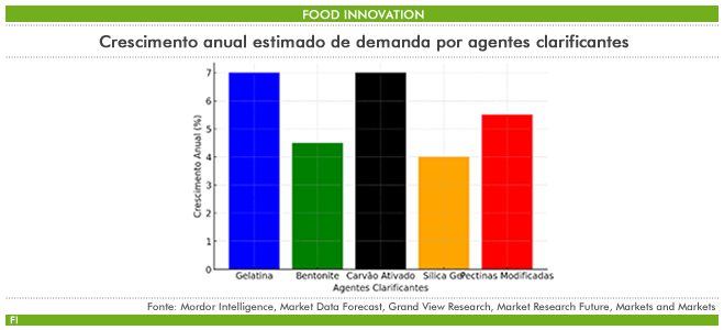Outro agente amplamente utilizado é a bentonite, uma argila aplicada na clarificação de sucos de frutas, vinhos e bebidas vegetais, removendo proteínas que causam turbidez. Dados da Market Data Forecast, mostram que no mercado de vinhos, a bentonite representa cerca de 30% a 40% dos agentes clarificantes usados, e sua demanda deve crescer moderadamente, com aumento estimado de 4% a 5% ao ano, especialmente na produção de sucos e bebidas vegetais.
