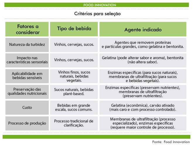 A seleção do agente de clarificação adequado envolve um equilíbrio entre a eficiência do processo, a preservação das qualidades sensoriais e nutricionais da bebida, a viabilidade econômica e as exigências do mercado, levando em consideração o tipo de bebida, o objetivo do processo de clarificação, as características sensoriais desejadas e as condições de produção, de forma que a sua aplicação resulte em uma bebida que não só atenda aos padrões de qualidade visual, mas também satisfaça as expectativas sensoriais e nutricionais do consumidor.