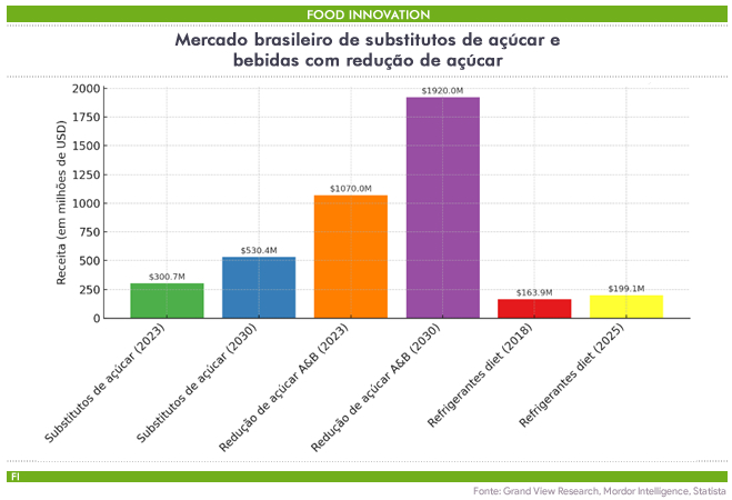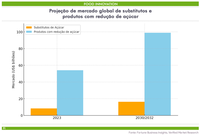 Esse panorama faz parte de um cenário mais amplo, no qual o mercado global de substitutos de açúcar, que inclui aplicações em alimentos e bebidas, foi estimado em US$ 8,36 bilhões em 2023 e deve alcançar US$ 16,31 bilhões até 2032, com crescimento médio de 7,9% ao ano, segundo a Fortune Business Insights. Considerando todos os produtos com redução de açúcar, o faturamento global chegou a US$ 54,1 bilhões em 2023, com projeção de atingir US$ 99 bilhões até 2030, de acordo com a Verified Market Research.