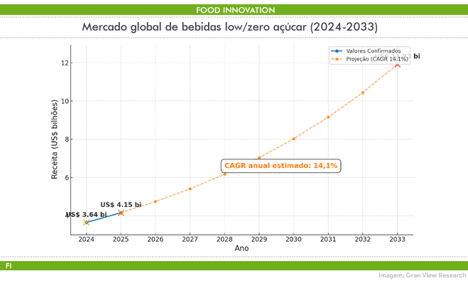 Nesse contexto, as projeções de mercado são otimistas. Dados da Grand View Research indicam que o segmento global de bebidas low/zero sugar movimentou US$ 3,64 bilhões em 2024 e deve alcançar US$ 4,15 bilhões em 2025. A previsão para 2033 é ainda mais ambiciosa: US$ 11,93 bilhões, sustentados por uma taxa média de crescimento anual (CAGR) de 14,1%.