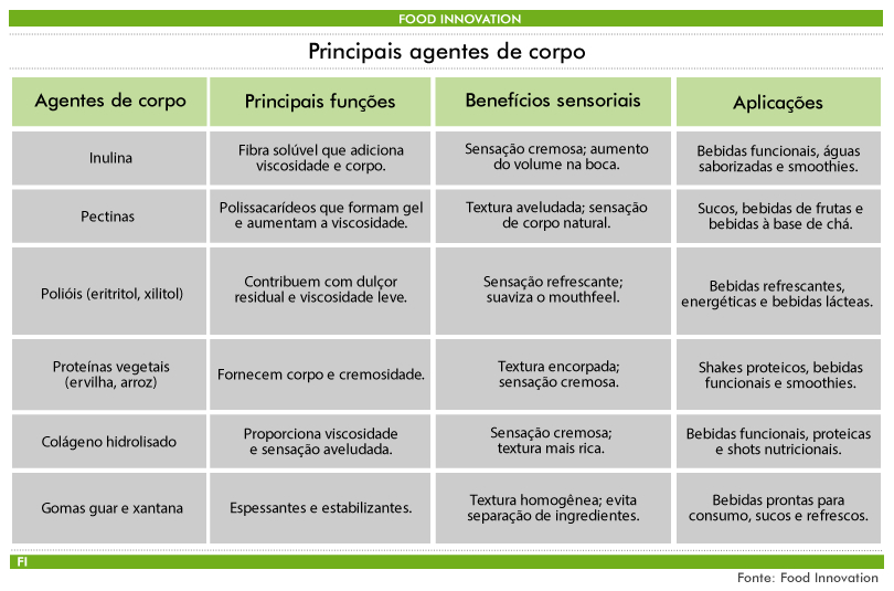 É nesse contexto que entram os agentes de corpo, ingredientes que atuam na textura moldando desde a viscosidade até a sensação de volume na boca. Polímeros hidrossolúveis, fibras solúveis, polióis e proteínas são algumas das opções disponíveis, cada uma com características únicas que possibilitam o desenvolvimento de bebidas com perfis táteis diferenciados.