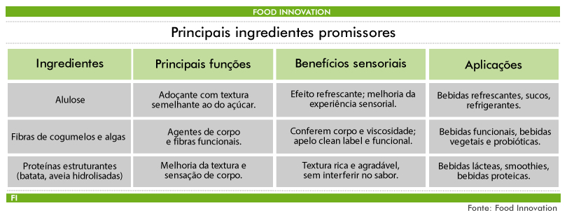 O uso de fibras solúveis multifuncionais, como inulina, polidextrose e fibra de aveia, também tem  crescido. Além de contribuírem com o perfil nutricional, ajudam a restaurar o corpo e a viscosidade das bebidas reduzidas em açúcar, conferindo mouthfeel mais agradável e semelhante ao produto convencional.