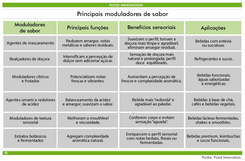 Alguns moduladores de sabor derivados de extratos botânicos ou fermentados também podem conferir sensação de complexidade aromática, que enriquece o perfil final da bebida, sem recorrer a intensificadores artificiais de sabor.