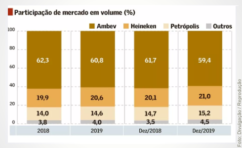 A Ambev manteve a liderança, com 59,4% em dezembro de 2019, queda de 2,3 pontos percentuais. No acumulado de 12 meses, a fatia é de 60,8%, ante 62,3% em 2018.