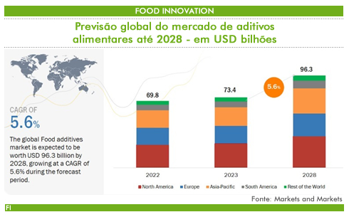 Segundo relatório da Markets and Markets, o tamanho do mercado global de aditivos alimentares foi avaliado em US$ 69,8 bilhões em 2022, com projeção de crescimento de US$ 73,4 bilhões em 2023 para US$ 96,3 bilhões até 2028, com CAGR de 5,6%. Esse crescimento é atribuído principalmente pela crescente demanda do consumidor por alimentos processados e de conveniência.
