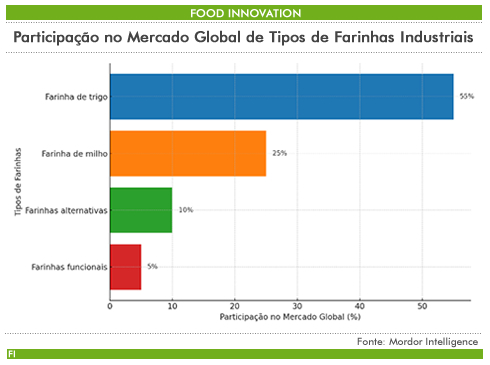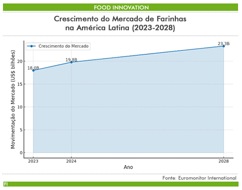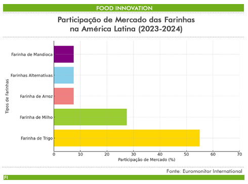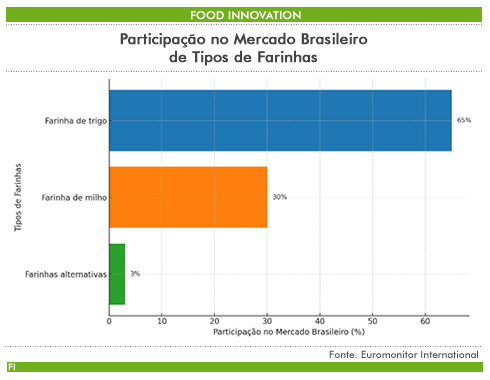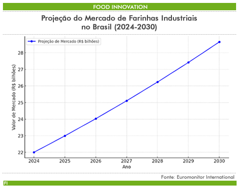 No Brasil, o mercado de farinhas industriais é dominado por ingredientes tradicionais como trigo e mandioca, mas também há avanços significativos em opções alternativas. Em 2024, o mercado brasileiro foi avaliado em aproximadamente R$ 22 bilhões, com projeção de crescimento anual de 4,5% até 2030, segundo a Euromonitor International.