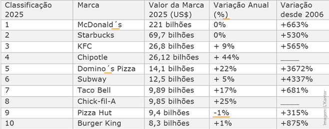 Abaixo, o ranking das mais valiosas na categoria fast food em 2025: