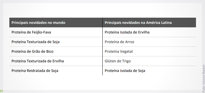 Esse crescimento gera competitividade e, a partir daí, somos levados à inovação. Os formuladores estão usando uma variedade crescente de ingredientes para trazer diferenciação a este mercado e fornecer qualidade comparável à proteína animal. O aumento da demanda por alimentos plant-based gerou a necessidade de desenvolver uma diversidade de fontes de proteínas vegetais e apresentá-las em diferentes formas. A predominância da soja está sendo desafiada pelo arroz e, apesar da recente escassez relacionada ao clima, pela proteína de ervilha. Isso não acontece apenas no Brasil, mas também no mundo todo, como exemplos vistos na tabela abaixo.