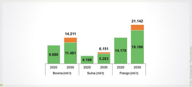 Projeção da produção brasileira de carnes bovina, suína e frango:
