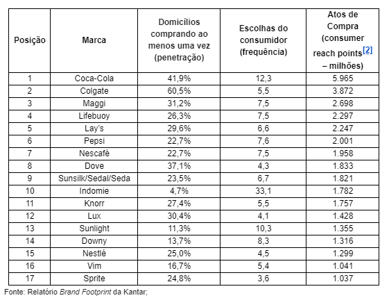 Tabela 1. As 17 marcas bilionárias no ranking global de marcas de consumo massivo revelado pelo relatório Brand Footprint