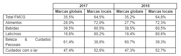 O estudo também mostra que marcas locais cresceram em 2018, já representam 64,8% de todas as marcas escolhidas pelos consumidores contra 35,2% das globais; um ganho de participação de 0,3% – que é uma desaceleração em comparação ao aumento de 0,5% em 2017. A maior conquista para marcas locais foi em cuidados pessoais, pois conseguiram aumentar em +0,7% o número de vezes que os consumidores as escolheram.