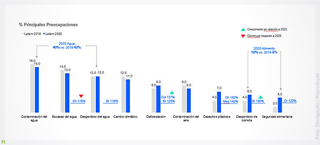Globalmente, a maior preocupação ambiental segue sendo a mudança climática, que foi citada por 16,4% dos consumidores em 2019 e por 16,8% em 2020. Na sequência vieram os resíduos plásticos (14% em 2019 x 14,8% em 2020), contaminação da água (10,9% x 9,7%), escassez de água (8,4% x 8,5%) e contaminação do ar (7,3% x 8,4%).