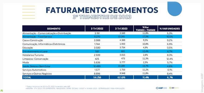 Indicando ter superado a fase de recuperação mais aguda da pandemia, o setor de franquias manteve a curva de crescimento e registrou uma alta de 11,4% no seu faturamento no terceiro trimestre deste ano. É o que aponta a Pesquisa Trimestral de Desempenho realizada pela ABF – Associação Brasileira de Franchising. O estudo mostra que o faturamento do setor passou de R$ 56,256 bilhões para R$ 62,676 bilhões nesse período, comparado aos mesmos meses de 2022. Frente ao terceiro trimestre de 2021, a variação positiva foi quase três vezes maior, de 32,3%. Em relação a igual período de 2020 (início da pandemia), a receita cresceu ainda mais, 42,6%, e comparada a 2019, a alta foi de 32,8%.