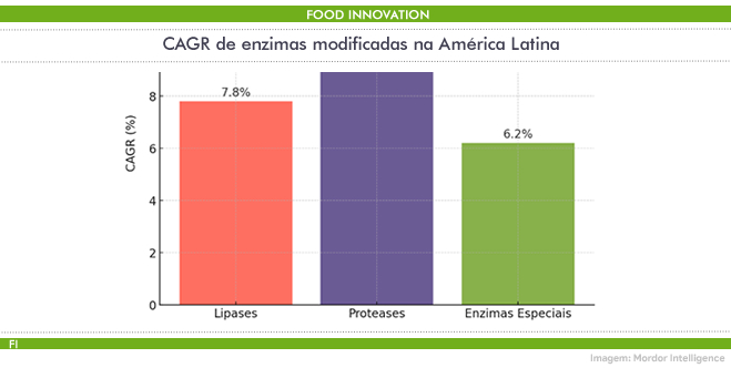 As proteases, utilizadas para modificar proteínas, melhorando textura, digestibilidade e rendimento em carnes, laticínios e bebidas vegetais. A América Latina registra CAGR de 9,4% nesse segmento, considerado um dos mais promissores da região (Mordor Intelligence).