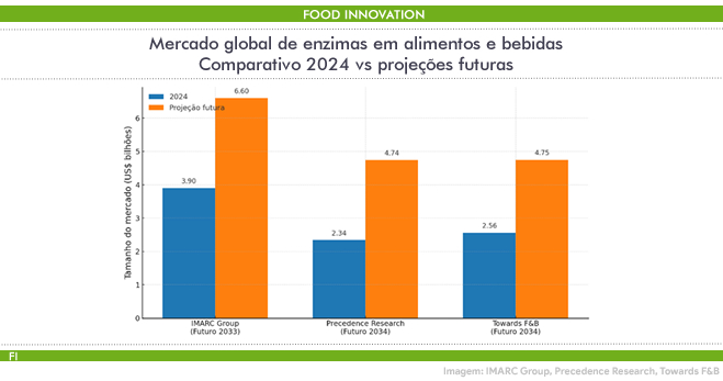 Esse movimento tecnológico encontra respaldo em um mercado em franca expansão, que promete ainda mais espaço para soluções de modificação enzimática. Segundo o relatório da IMARC Group, o setor movimentou globalmente US$ 3,9 bilhões em 2024 e deve chegar a US$ 6,6 bilhões até 2033, crescendo a uma taxa média de 5,8% ao ano entre 2025 e 2033. Outras consultorias, como a Precedence Research e a Towards F&B, trabalham com faixas próximas, apontando o segmento entre US$ 2,3 e US$ 2,6 bilhões em 2024, com crescimento anual na casa de 6,7% a 7,4% até 2034.