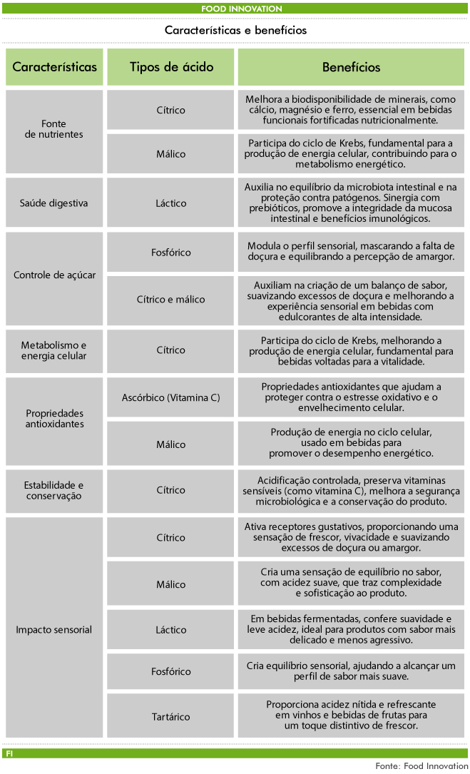 Corroborando com esses dados, o Banco de Dados Global de Novos Produtos – Análise de bebidas lançadas no Brasil entre 2022 e 2024, da Mintel GNPD, indica que o uso de ácidos com apelo natural tem crescido em produtos voltados ao bem-estar e à funcionalidade, refletindo a demanda por rótulos mais compreensíveis.