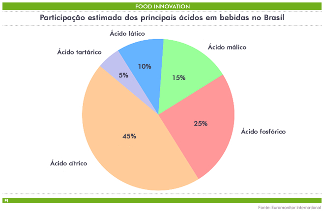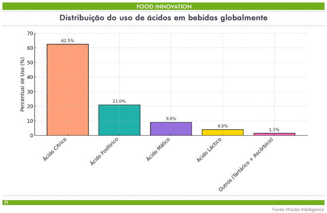 As estimativas apontam que o ácido cítrico lidera com cerca de 45% de participação nas formulações, seguido pelo fosfórico (25%), málico (15%), láctico (10%) e tartárico (5%).