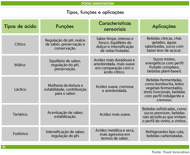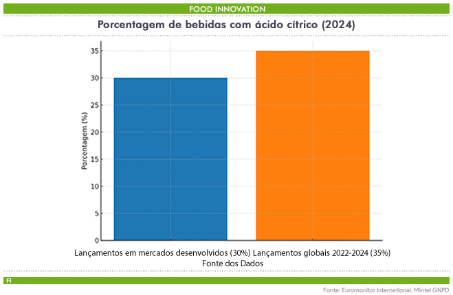 O relatório Global Soft Drinks Trends 2024, da Euromonitor International, aponta que cerca de 30% dos novos lançamentos de bebidas em mercados desenvolvidos mencionam “ácidos naturais” na lista de ingredientes, com ênfase no ácido cítrico como o mais utilizado.