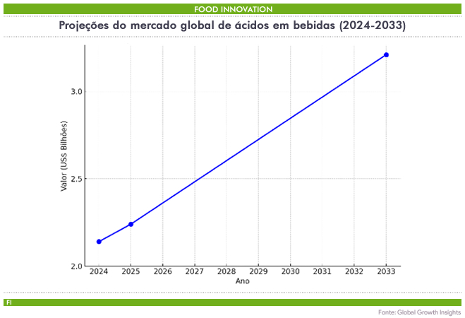 Segundo relatório da Global Growth Insights, o mercado global de ácidos utilizados em bebidas foi avaliado em US$ 2,14 bilhões em 2024, com projeções de chegar a US$ 2,24 bilhões em 2025 e US$ 3,21 bilhões até 2033, apresentando uma taxa de crescimento anual composta (CAGR) de 4,6% durante o período de previsão de 2025 a 2033.