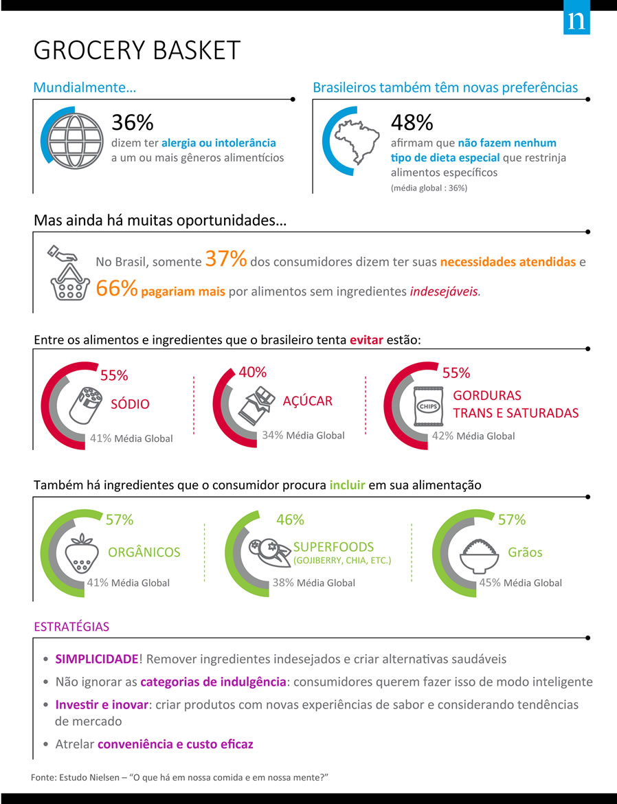 Sensibilidade a alimentos também está influenciando preferências alimentares. Mais de um terço (36%) dos respondentes globais dizem ter alergia ou intolerância a um ou mais gêneros alimentícios, os dados de vendas no varejo têm mostrado forte crescimento no Reino Unido, Alemanha e Estados Unidos de produtos específicos para pessoas que sofrem de sensibilidade alimentar.