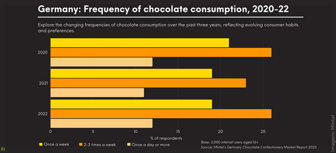 A Alemanha é outra nação de grandes consumidores de chocolate. Em 2023, a Mintel informou que três quartos dos consumidores alemães comem chocolate pelo menos uma vez por semana , com mais de 10% comendo chocolate uma vez por dia ou mais. Mais de metade dos consumidores alemães concorda que comer chocolate é uma forma acessível de melhorar o seu humor, e a maioria prefere comprar blocos de chocolate que podem ser consumidos em várias ocasiões. Isto diz-nos que comer chocolate faz parte de uma rotina regular dos consumidores alemães, em vez de ser uma guloseima ocasional e imprevisível.