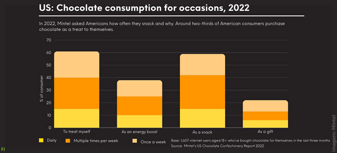 Assim, os EUA parecem ser um mercado estável para produtos de confeitaria de chocolate, mas em que circunstâncias os americanos são tentados a comprar? Cerca de dois terços dos consumidores americanos compram chocolate como guloseima, em comparação com um terço que compra chocolate como reforço energético, sugerindo que o consumo de chocolate nos EUA é mais comum por prazer do que por praticidade. Isto é ainda reiterado pelo facto de mais de metade dos americanos que comeram mais chocolate em 2022 atribuírem isso a um desejo crescente de indulgência.