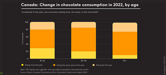 No que diz respeito às atitudes canadianas em relação ao consumo de chocolate, parece que os consumidores apreciam principalmente a conveniência dos snacks de chocolate, embora alguns prefiram escolher opções mais saudáveis. Mais da metade das pessoas que comeram menos chocolate e doces no Canadá em 2022 fizeram um esforço consciente para reduzir a ingestão de açúcar. Por outro lado, dois terços das pessoas que comeram mais chocolate e doces em 2022 o fizeram porque comem mais em casa.