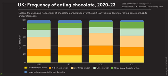 O Reino Unido é uma nação de amantes do chocolate, como evidenciado pelo facto de 95% dos britânicos comerem chocolate . Um impressionante número de quatro em cada cinco britânicos comem chocolate uma vez por semana ou mais, tornando-o uma parte regular da dieta britânica. Isto diminuiu ligeiramente desde 2022, com uma mudança no sentido de comer chocolate apenas uma vez a cada quinze dias ou com menos regularidade do que anteriormente. Mas por que os britânicos estão comendo menos chocolate em 2023? Uma razão pode ser que os produtos HFSS (ricos em gordura, açúcar ou sal) tenham enfrentado restrições mais rigorosas sobre onde podem ser localizados nas lojas desde Outubro de 2022, pelo que os produtos de confeitaria, incluindo chocolate, são menos visíveis para os consumidores do que anteriormente. Isto causou um declínio na compra impulsiva de chocolate, especialmente porque em 2022 quase 7 em cada 10 consumidores britânicos declararam que compram chocolate impulsivamente em ofertas promocionais . Em 2023, porém, apenas um terço dos consumidores britânicos afirmaram que compraram chocolate para si próprios porque estava numa oferta especial.