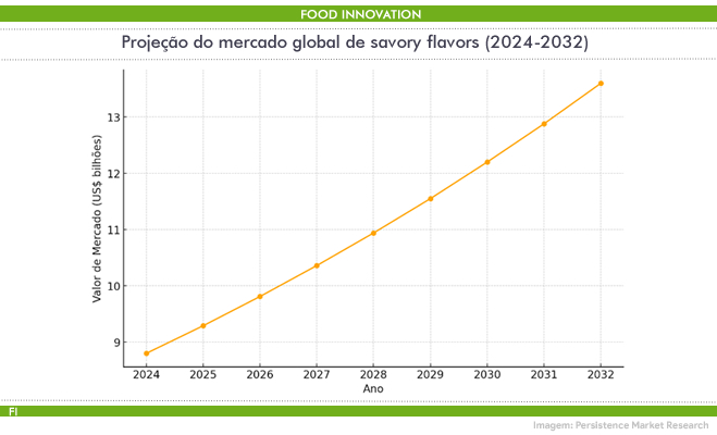 A paleta sensorial criada pelos savory flavors movimenta um mercado global avaliado em cerca de US$ 8,8 bilhões em 2024, com projeções de chegar a US$ 12,9 bilhões até 2032, crescendo a uma taxa anual composta (CAGR) de 5,6% entre 2025 e 2032, segundo dados da Persistence Market Research. Alimentos e bebidas concentram mais de 80% da aplicação desses ingredientes, em categorias que incluem snacks, caldos, sopas, molhos e refeições prontas. Essa expansão está diretamente relacionada à busca por naturalidade, clean label e experiências sensoriais autênticas, que têm impulsionado o uso de tecnologias capazes de reproduzir sabores complexos e equilibrar perfis gustativos, reduzindo sódio, gordura e aditivos artificiais.
