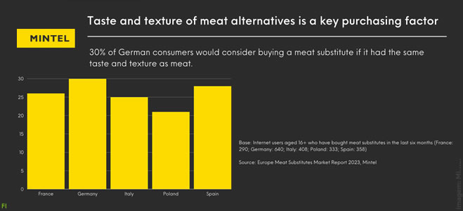 A sustentabilidade é um factor chave, mas por si só pode não ser suficiente para influenciar os hábitos alimentares dos consumidores; deve ser acompanhado de sabor. Um terço dos consumidores alemães e um quarto dos consumidores franceses concordam que um produto com o mesmo sabor e textura que o seu equivalente de carne os encorajaria a comprar um substituto de carne em detrimento de outro . Uma empresa que utiliza tecnologia e ingredientes para fornecer textura desejável em alternativas proteicas é a marca austríaca Revo. Eles anunciaram o lançamento de um salmão vegano utilizando impressão 3D com a ambição de entregar a mesma escamação e fibras suculentas do salmão convencional.