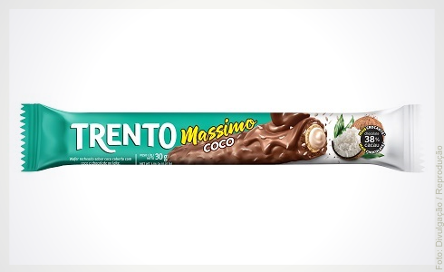A linha acaba de ganhar uma versão aprimorada da clássica combinação de coco com chocolate: o Trento Massimo Coco. Com dupla cobertura de chocolate 38% cacau, lascas de coco natural na cobertura, wafer crocante e recheio cremoso sabor coco, o Trento Massimo Coco é garantia de sucesso.