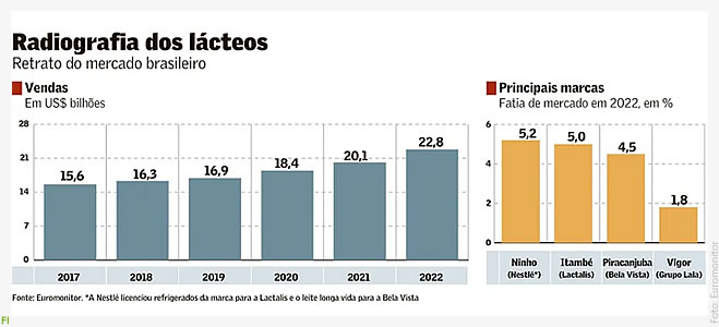 No último balanço da Vigor disponível, de 2021, a empresa teve receita de R$ 2,6 bilhões, montante 5,3% menor que o de 2020. A companhia teve Ebtida negativo de R$ 1,2 bilhão (no ano anterior, ela havia tido lucro de R$ 46,1 milhões), resultado atribuído à reavaliação de valor de ativos (“impairment)”. De um ano a outro, a receita líquida do Lala cresceu 7,4%, para US$ 4 bilhões, e o resultado líquido subiu 18,5%, para US$ 69,6 milhões, de acordo com o Valor Data.